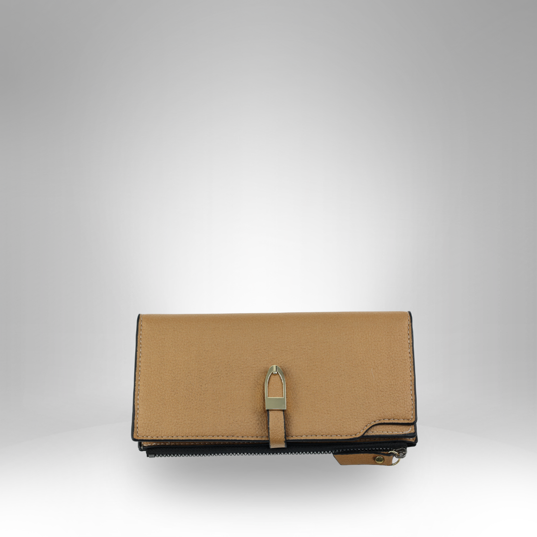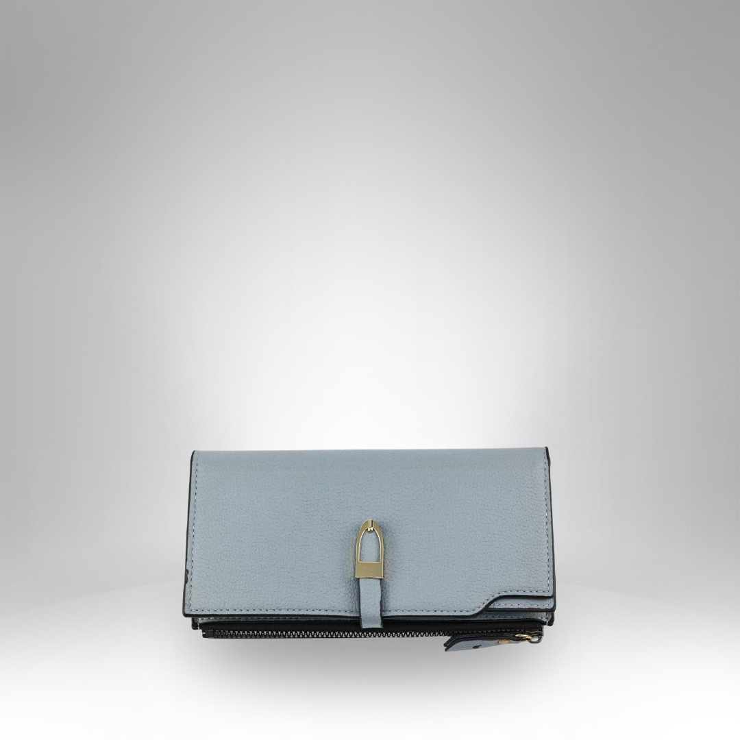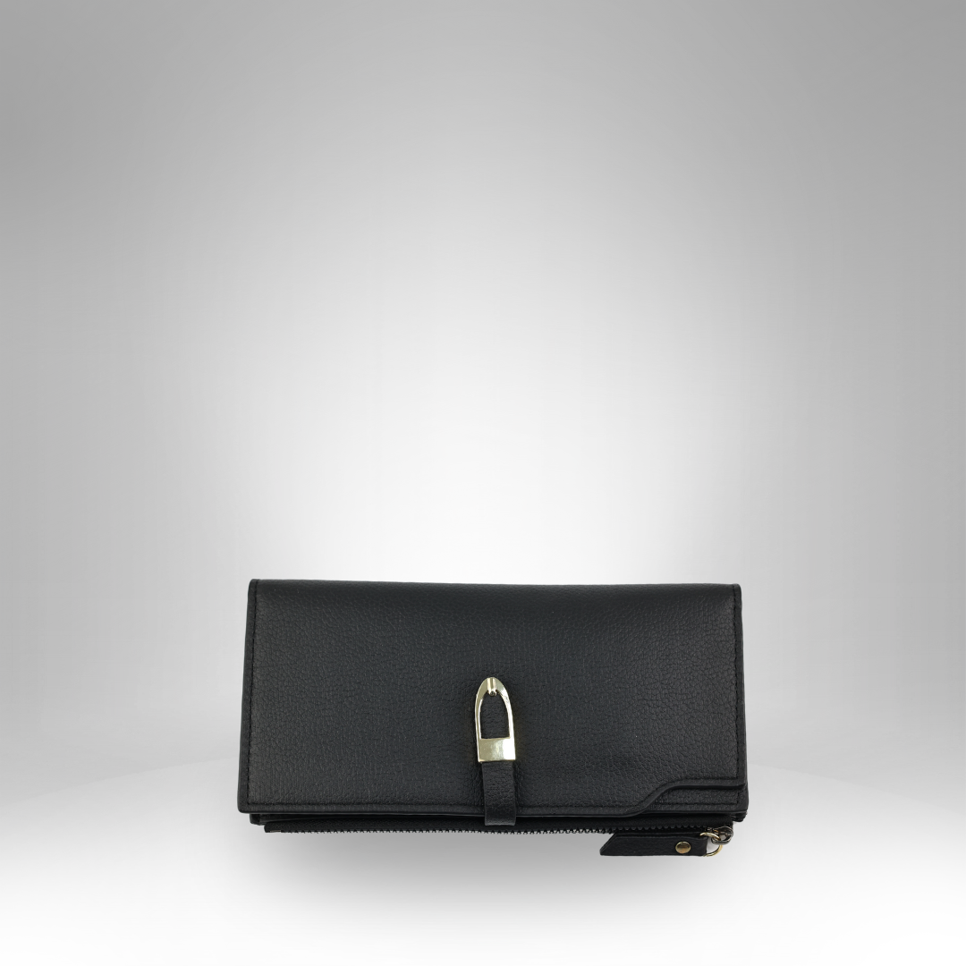 With its compact yet functional design, this wallet fits effortlessly into handbags or can be carried as a chic clutch. The minimalist design and metallic detailing make it a versatile and timeless accessory that elevates your everyday style.