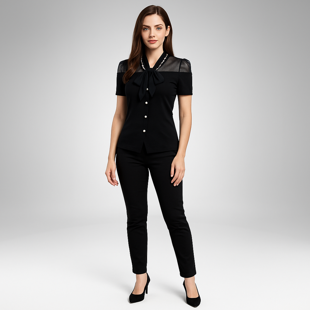 Elevate your wardrobe with our Elegant Pearl-Button Bow Blouse for Women – a timeless blend of sophistication and feminine charm. Designed with meticulous attention to detail, this blouse features a luxurious bow-tie neckline that exudes grace and elegance. The sheer mesh shoulder panels add a modern, delicate touch, while the pearl-inspired buttons running down the front offer a refined, classic appeal.