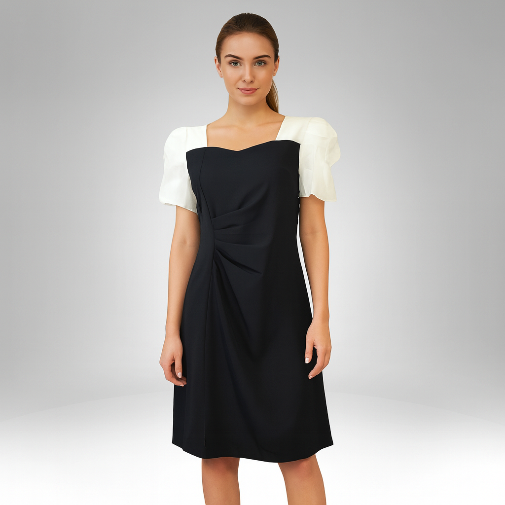 Step into refined elegance with our Women’s Black and White Puff Sleeve Midi Dress, a sophisticated blend of modern style and timeless charm. This striking two-tone dress features a black midi-length body with a flattering sweetheart neckline and delicate pleat details at the front for added texture and shape. The contrasting white puff sleeves bring a romantic touch, balancing structure and softness for a truly feminine look.