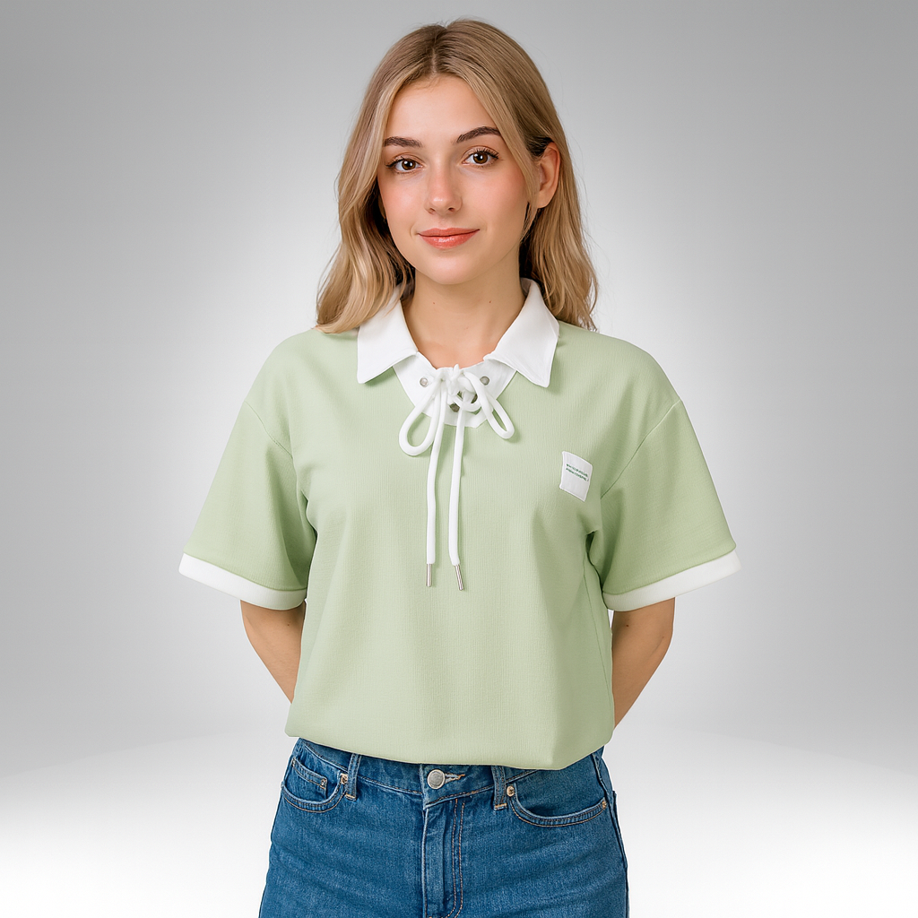 Elevate your everyday wardrobe with our Women’s Contrast Collar Lace-Up Short Sleeve Top – the perfect blend of casual comfort and refined style. Designed with a striking contrast collar and sleeve trim, this top delivers a polished yet playful look that suits both relaxed and semi-formal occasions. The lace-up neckline adds a touch of individuality, giving you the flexibility to adjust the fit and style to your preference.