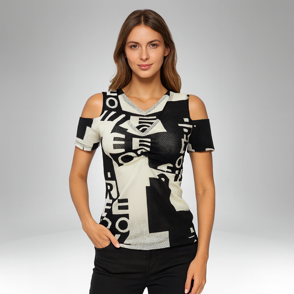 Make a bold style statement with our Women’s Graphic Print Cold Shoulder Top, designed for fashion-forward women who love unique details. Featuring a dynamic black-and-white abstract print with playful letter patterns, this top instantly adds edge to any outfit. The cold shoulder cut-outs give a modern, trendy touch while allowing for comfortable airflow, making it perfect for both warm weather and layering.