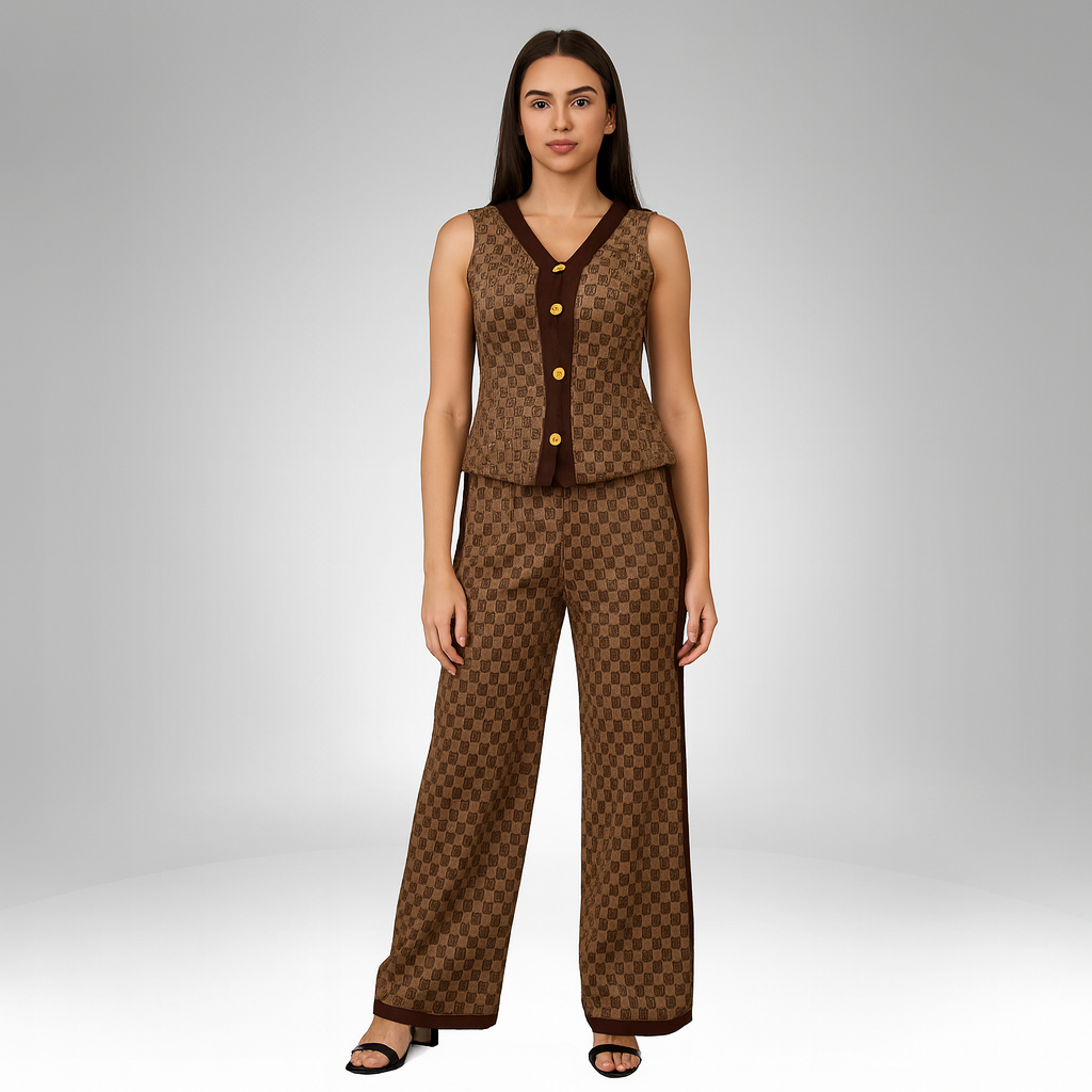 Elevate your wardrobe with our Women’s Monogram Two-Piece Set, a perfect blend of sophistication and comfort for modern fashion lovers. Designed with meticulous attention to detail, this set includes a sleeveless button-front top and wide-leg trousers, both featuring an elegant all-over monogram pattern that adds timeless appeal.