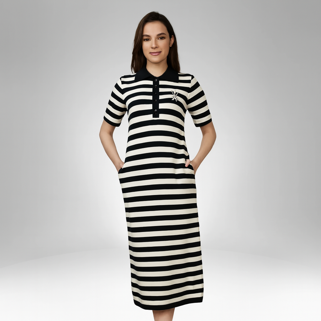 Elevate your everyday wardrobe with our Women’s Polo Collar Maxi Dress, designed for those who appreciate a perfect balance of comfort and sophistication. This versatile piece comes in both a chic black-and-white striped pattern and a sleek solid black version, giving you multiple styling options for any occasion.