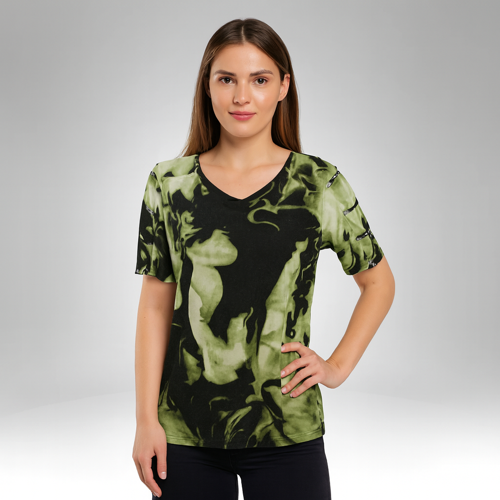 Available in two stunning designs — a bold red rose print against a deep black backdrop for a romantic, statement look, and a green abstract pattern with a modern, artsy flair — this top offers versatile styling options to suit your mood and occasion.