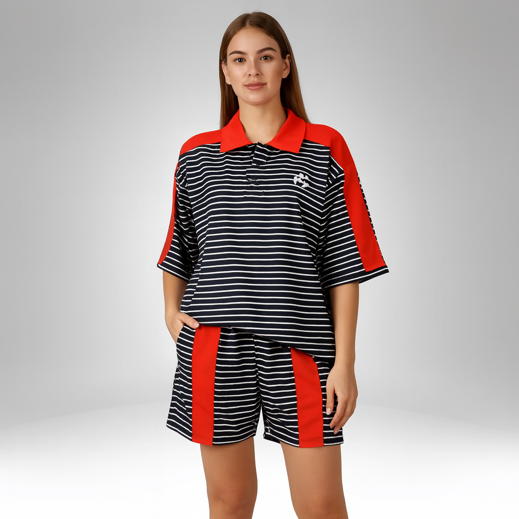 Elevate your casual style with our Women’s Striped Polo Shirt and Shorts Set—an effortlessly chic combination that blends sporty flair with everyday comfort. The polo shirt features a bold red collar and striking red sleeve panels that contrast beautifully against the black-and-white horizontal stripes. A subtle embroidered emblem on the chest adds a touch of refined detail, making this top stand out in your casual wardrobe.